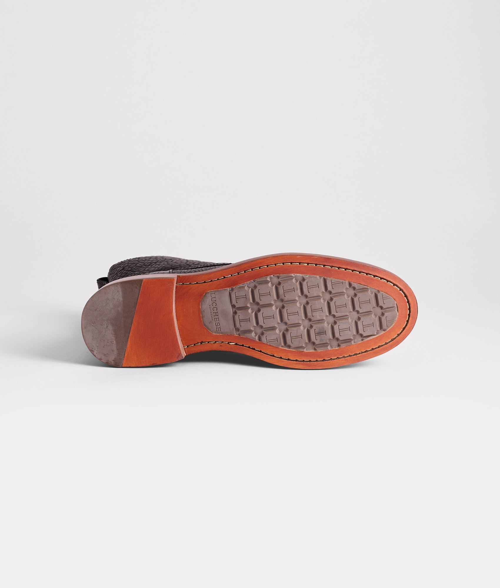 Crafted from premium American bison. the Lace-Up Derby Boot has a stacked-leather heel and 6-inch shaft. The contemporary style with Western inspiration is meant to pair with cuffed jeans or chinos to turn heads.