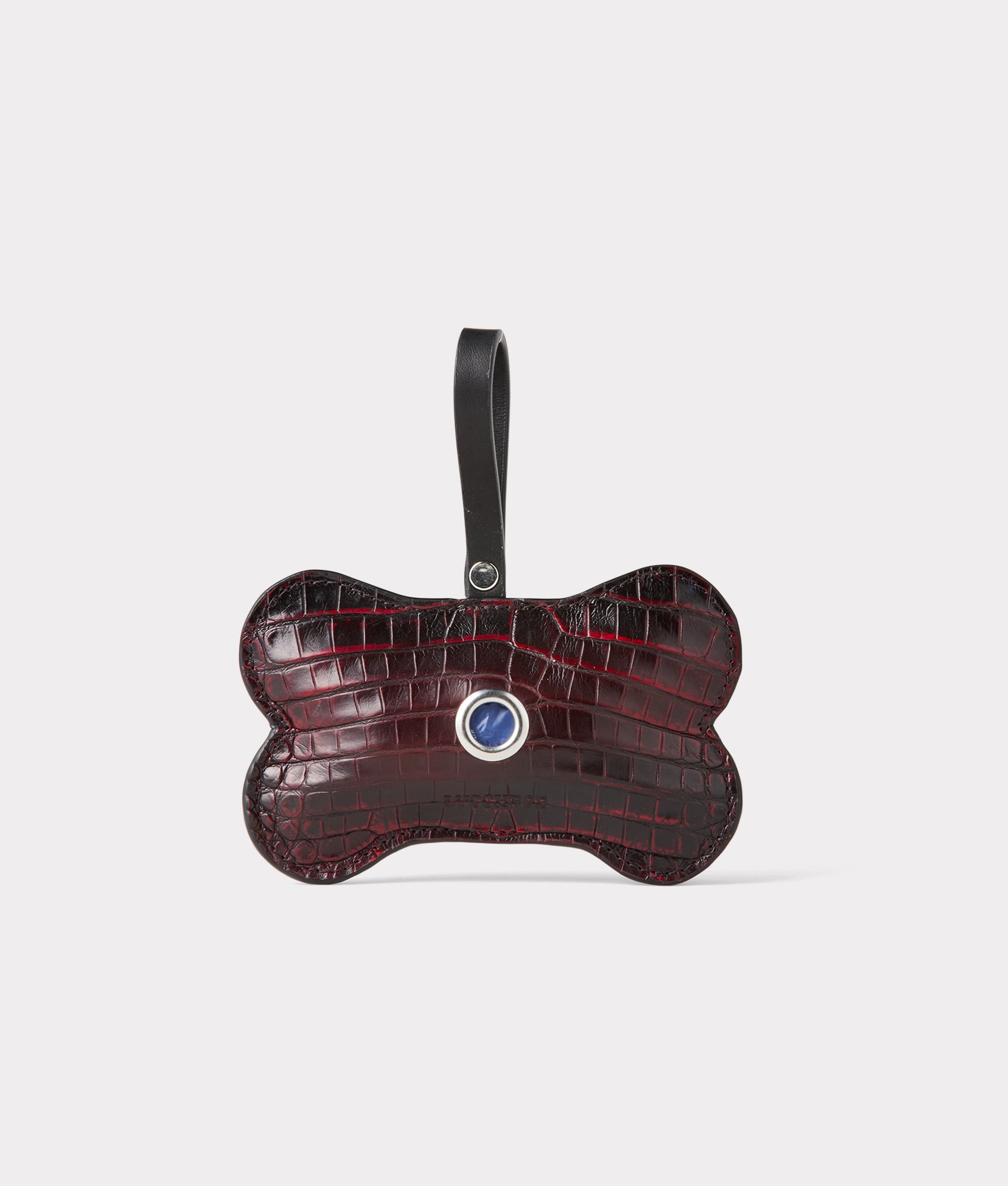 The Dog Bags Holder brings a touch of ease to everyday walks. Crafted from black cherry Caiman. it opens and closes seamlessly for quick refills and attaches easily to a Lucchese leash. belt loop. or bag using the antique nickel clip. Go to the nearest Lucchese Store to get a custom embossing with your pup’s name.
