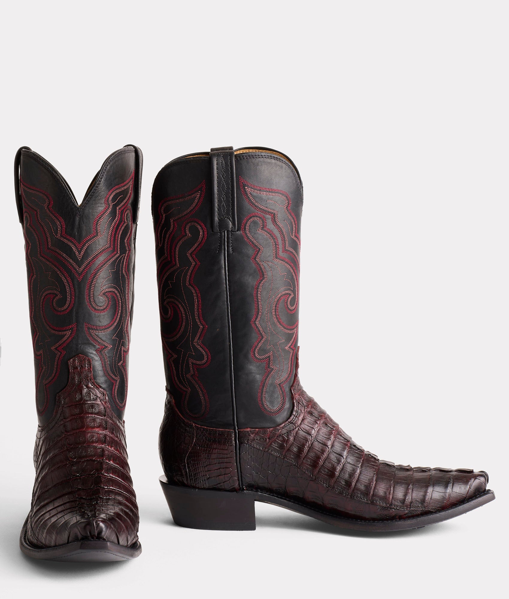 Named after the Texas town within the territory of the Brazos Valley. Franklin reflects the topography of the Lone Star landscape – rough country ridges. tall Texas pines. and seas of wide open pasture land. Textured Hornback Caiman Tail vamps adorned with smooth Ranch Hand leather quarters provide the ultimate illustration of the Texas terrain. Handmade in Texas.