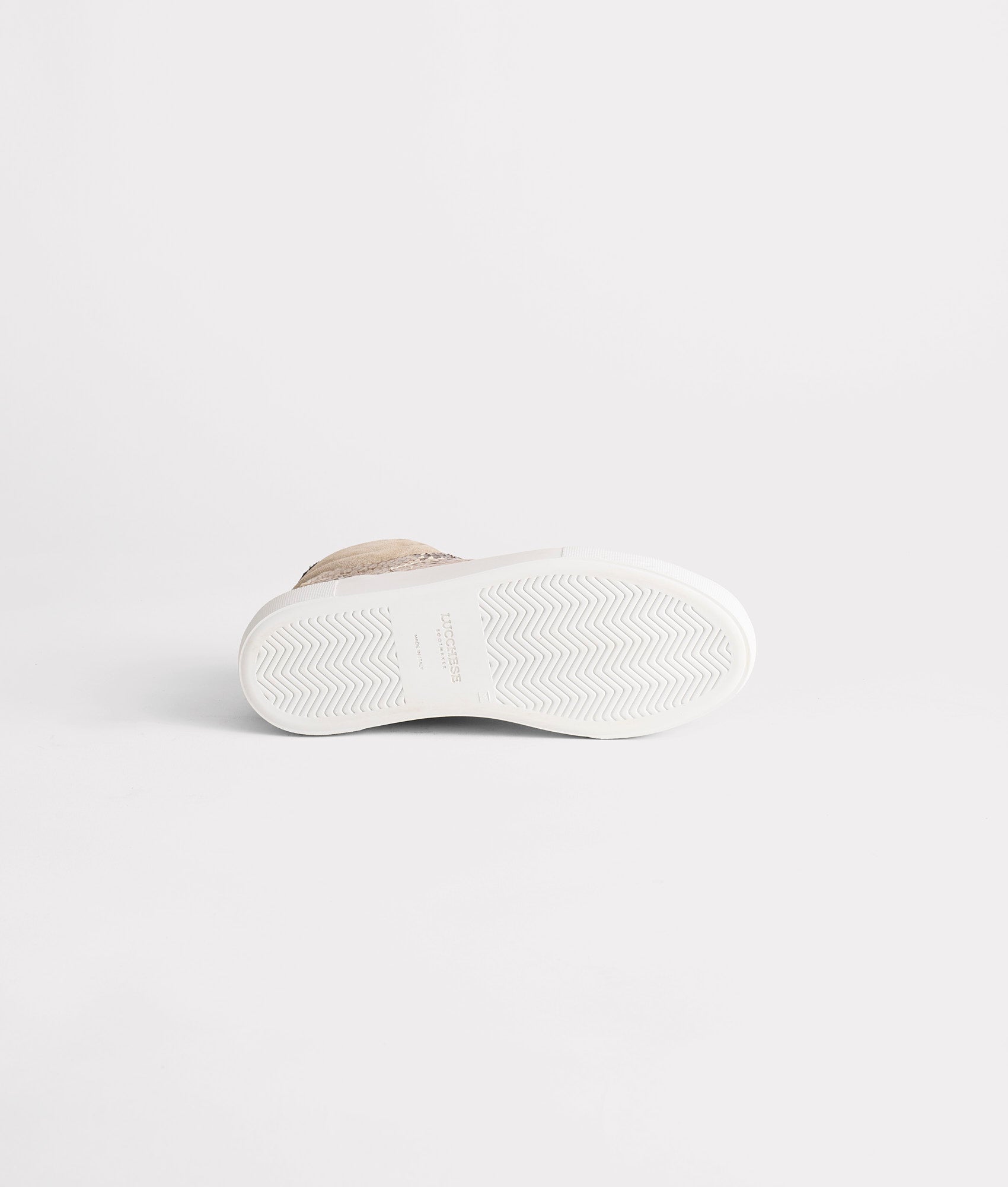 Mosaico means mosaic in Italian—a name that perfectly captures the persona of this Italian handcrafted sneaker. Like a mosaic. where individual pieces come together to create a breathtaking whole. the Mosaico High-Top Sneaker unites every detail—material. texture. and form—into a wearable work of art. Crafted by master artisans. this women’s sneaker is crafted from genuine python. with each pair offering a unique pattern and cut. The high-top silhouette is a statement. laced for a personalized fit and grounded by a durable rubber sole for all-day comfort. Handmade in Italy.