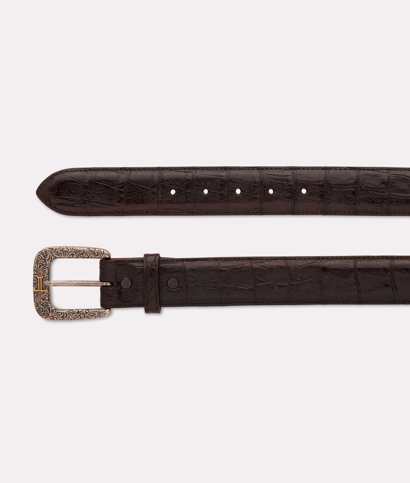 Lucchese’s exotic belt made with caiman crocodile. The belt’s ultra belly caiman leather not only provides sleek style. but also ensures durability for long lasting use. Adorned with a detailed silver plated buckle. this belt pays homage to the classic West. Handmade in Texas. 1.5 wide Removable buckle.