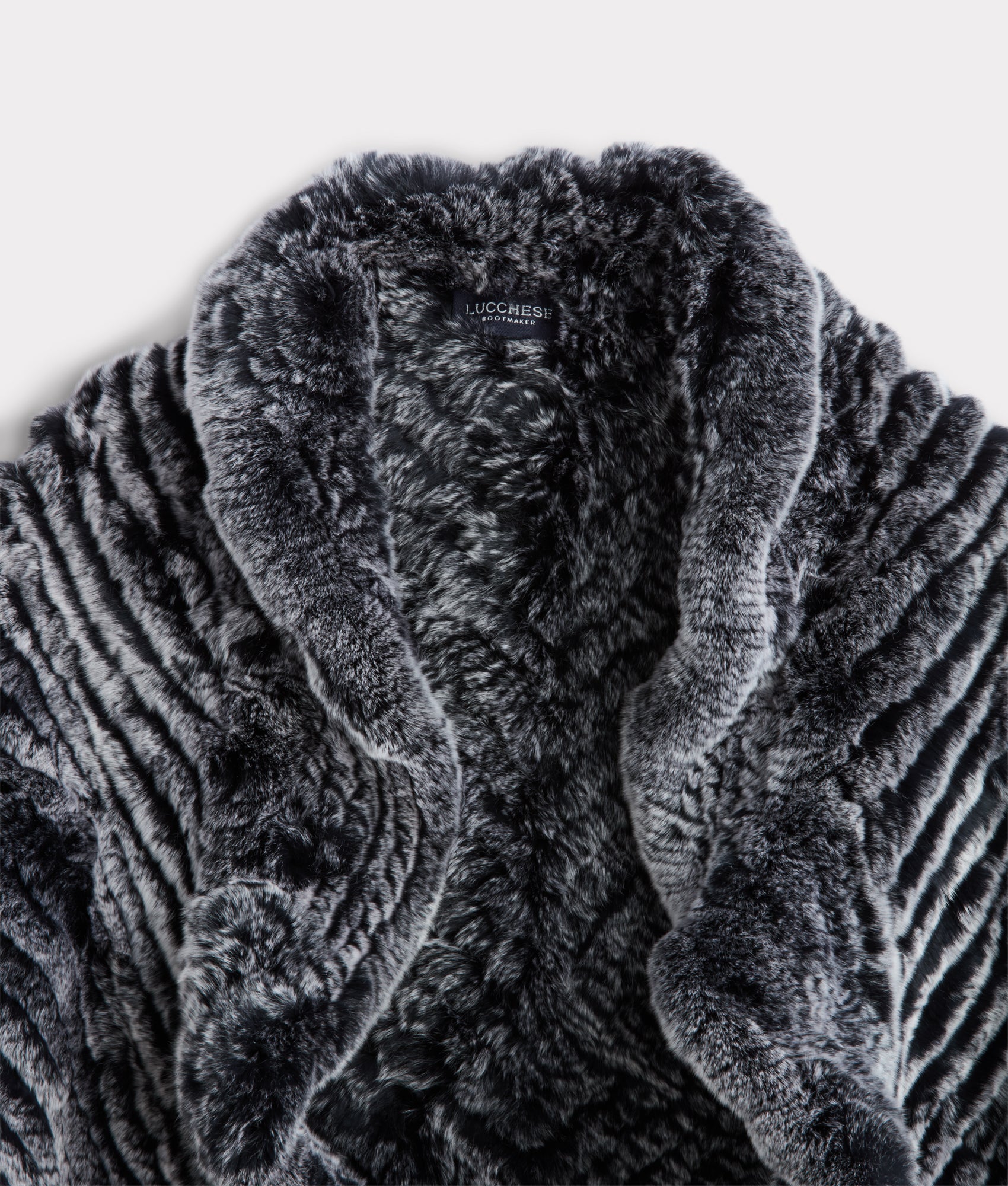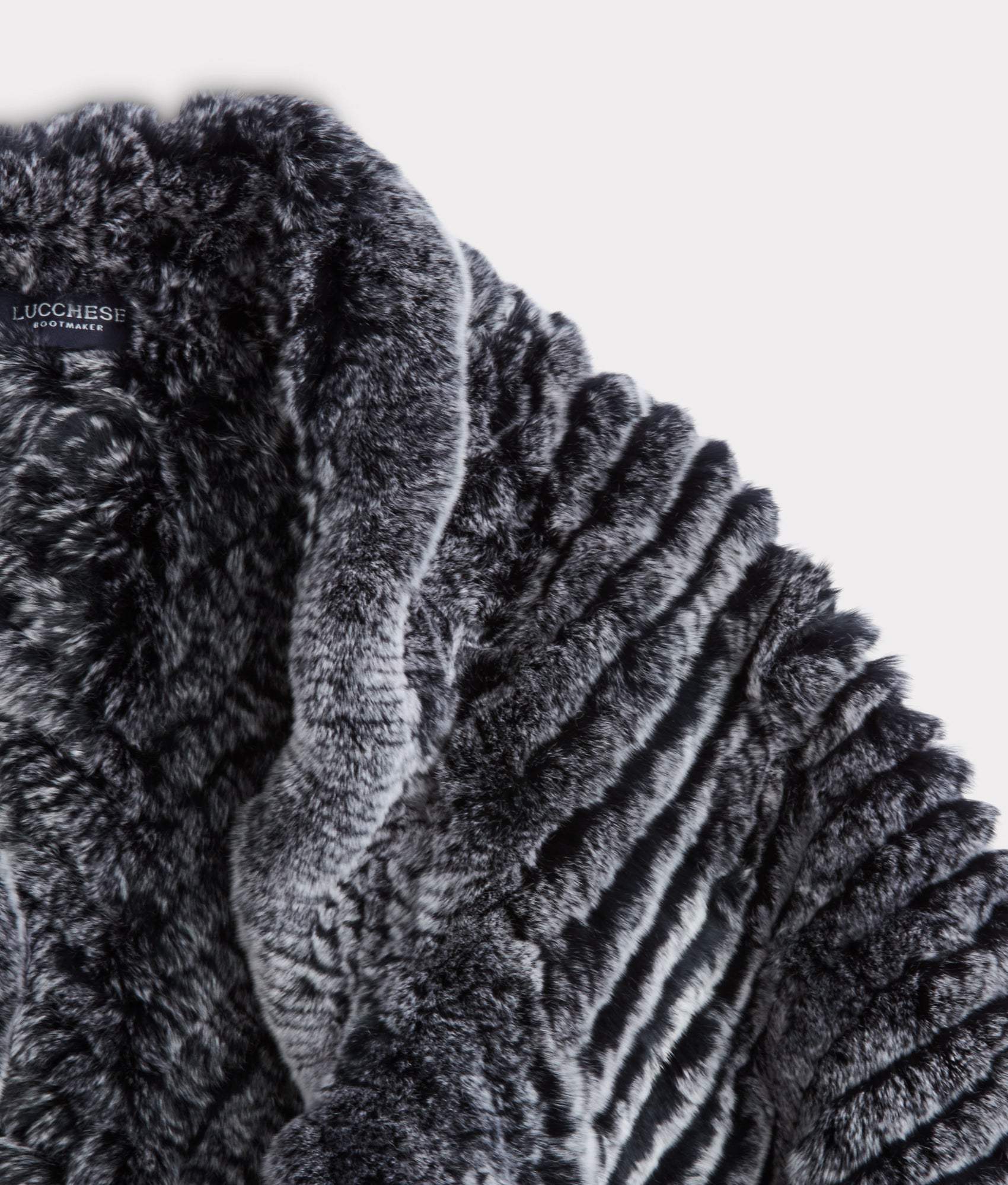Elevate your winter wardrobe with the luxurious Ashley Fur Poncho. crafted from 100% dyed rabbit fur. Featuring a sophisticated palette of blacks and greys. this piece exudes understated elegance while offering cozy warmth. The fur originates from Spain and has been carefully dyed to achieve a rich. multi-tonal effect.