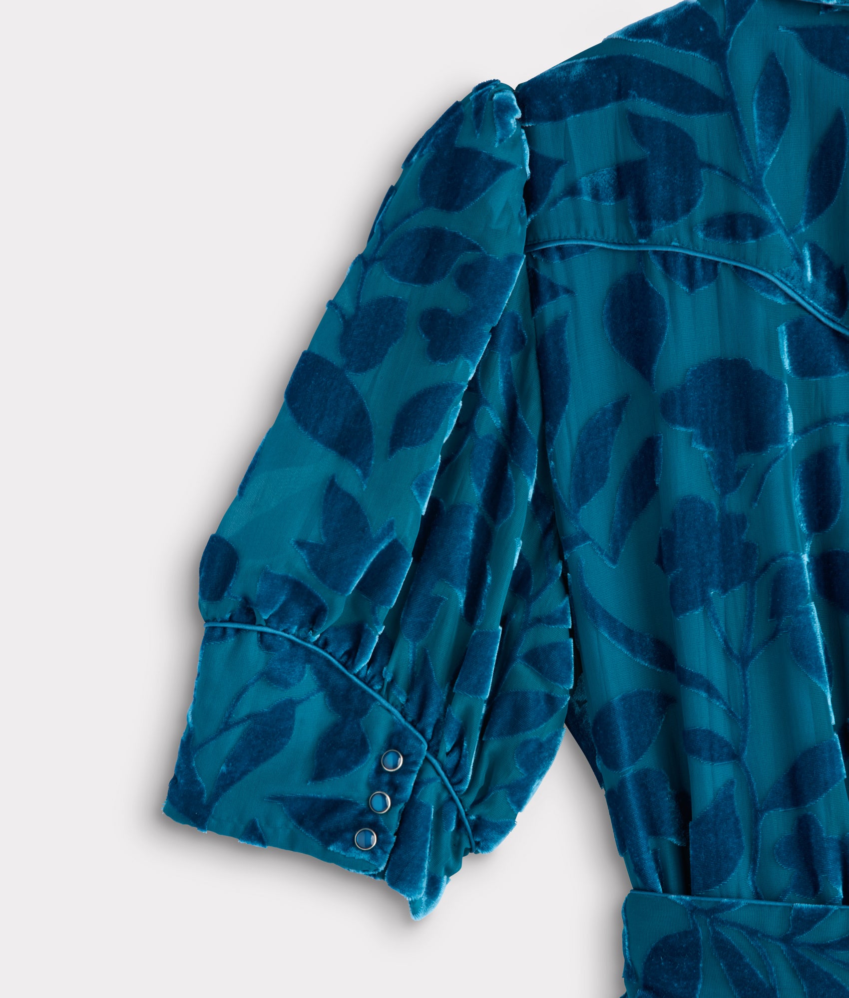 Rendered in a luminous turquoise velvet. the Avery Dress captures Western charm with an elegant. modern twist. Crafted from a rich blend of viscose and nylon. it features a sculpted Western yoke. delicate button closure. and voluminous balloon sleeves that add a soft sense of drama. The silhouette moves with ease and grace. balancing vintage Americana with refined femininity.