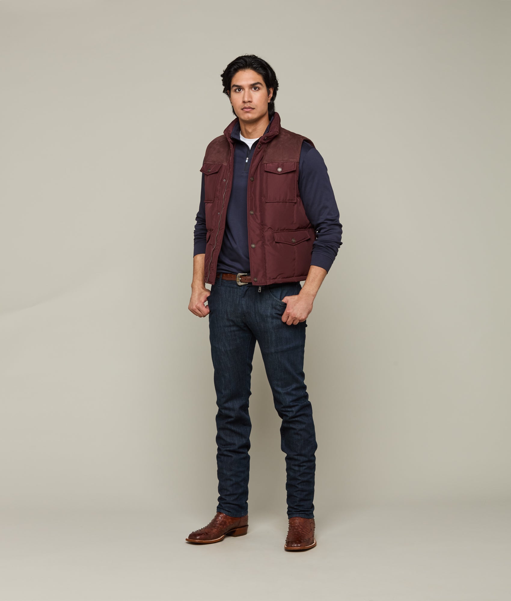 The John Puffer Vest is a refined blend of functionality and style. Crafted to provide superior warmth without compromising style. this vest features dual chest and side pockets for convenient storage. Its rich color palette adds a touch of elegance. making it a versatile choice for both outdoor adventures and urban settings. Perfect for layering during the colder months.