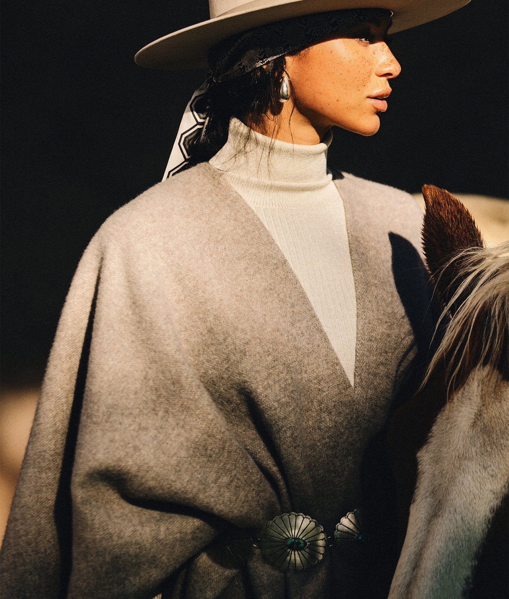 The King Concho Belt is an heirloom piece. It is hand-forged sterling silver shaped by artisans into a row of scalloped medallions. each etched with deliberate strokes and finished in a muted matte that lends visual texture and depth. At the center of every concho sits a mined Kingman turquoise stone. its desert-blue depth anchoring the belt in the southwestern landscape. Measuring 38 inches with an added 5-inch chain for adjustability. each 3 x 2.7 piece is a statement in proportion and precision.