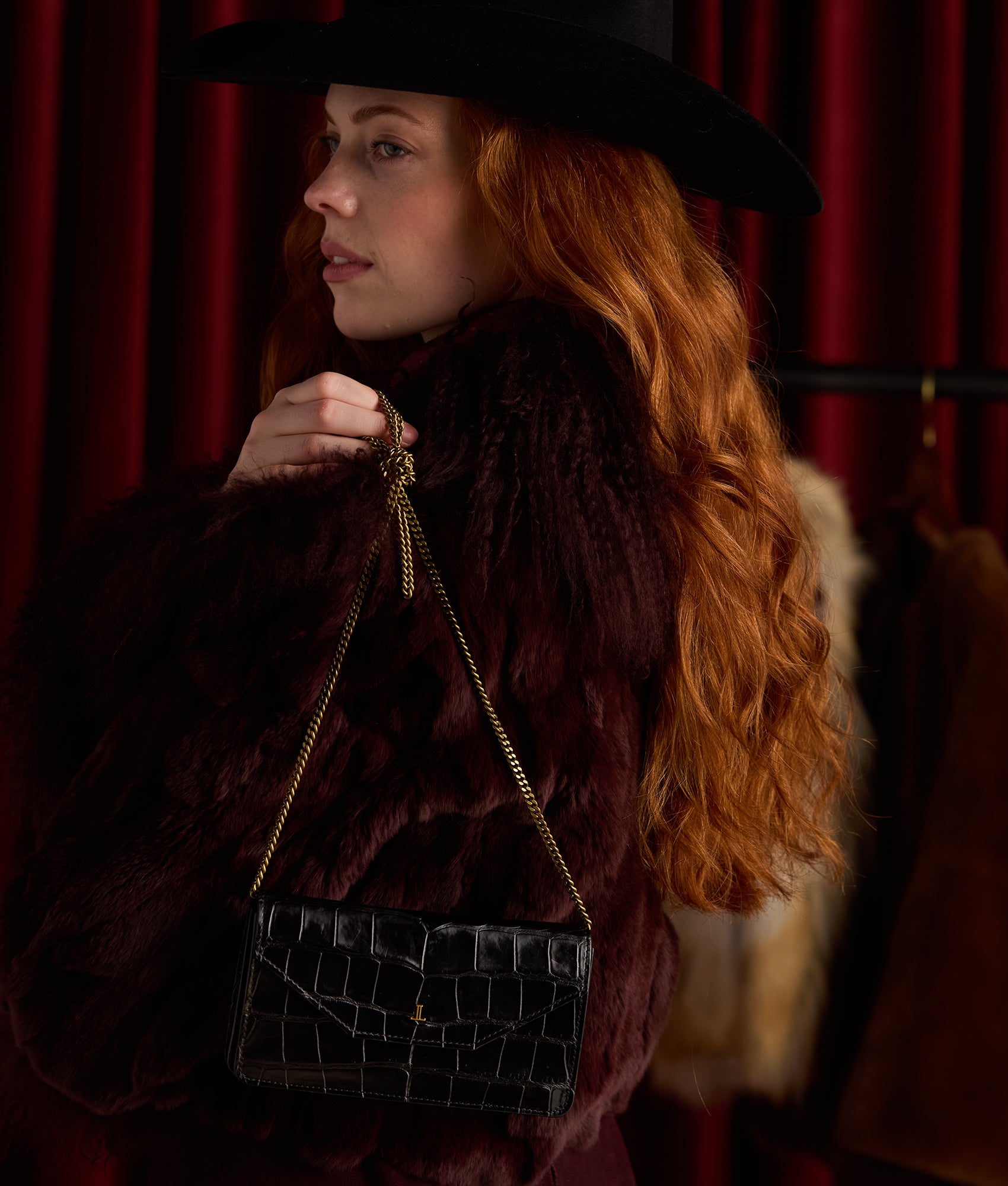 The Long Exotic Wallet On A Chain is a statement of luxury and sophistication. American Alligator leather is renowned for its perfect tile aesthetic and smooth texture. The elongated design provides ample space for your essentials. while the chain strap ensures effortless. hands-free convenience.