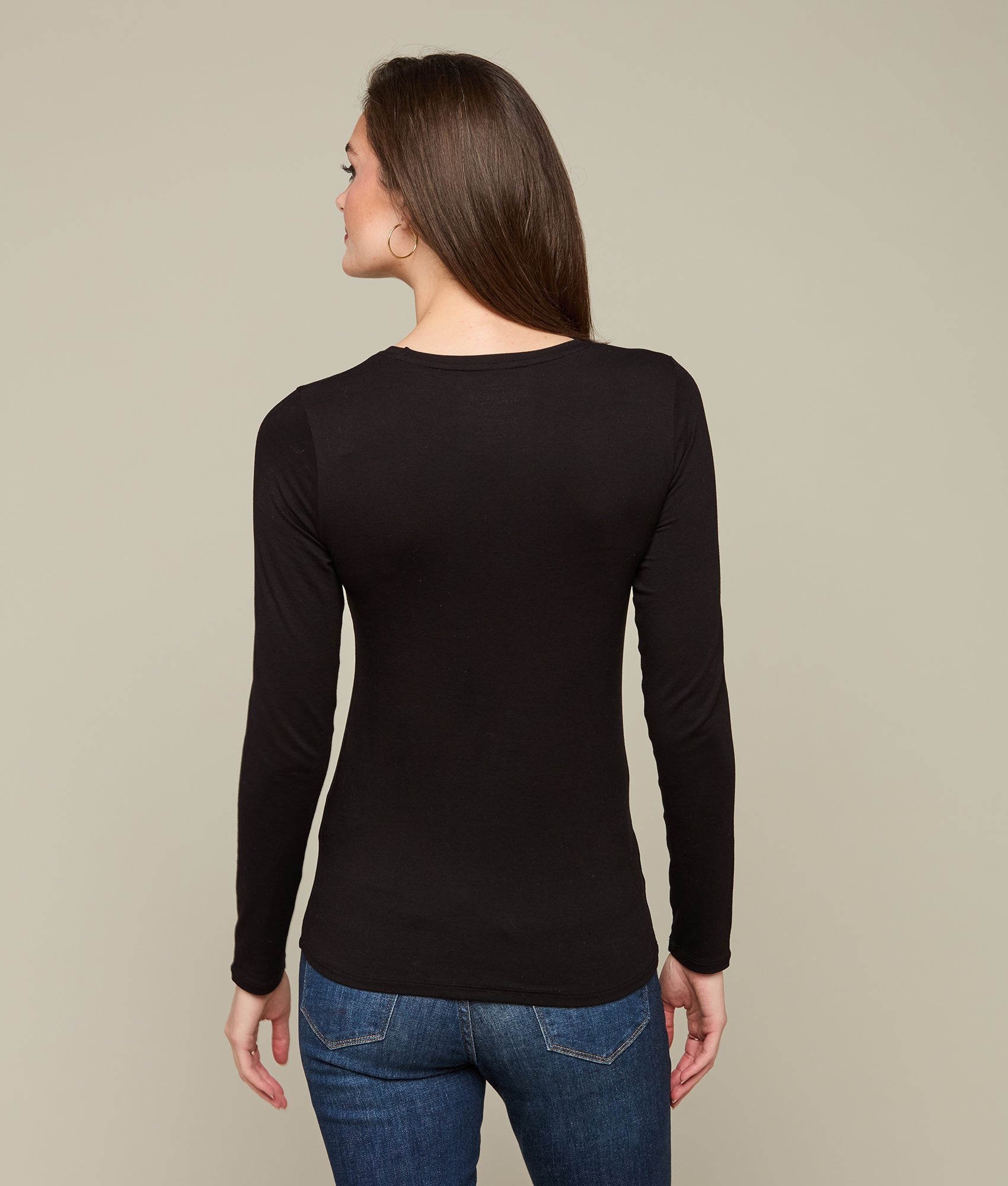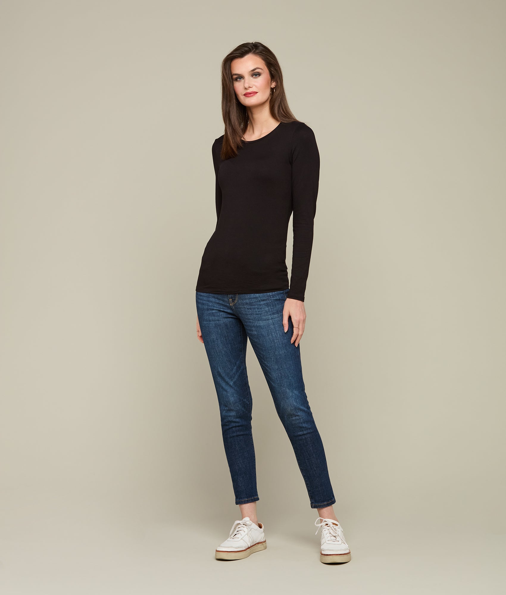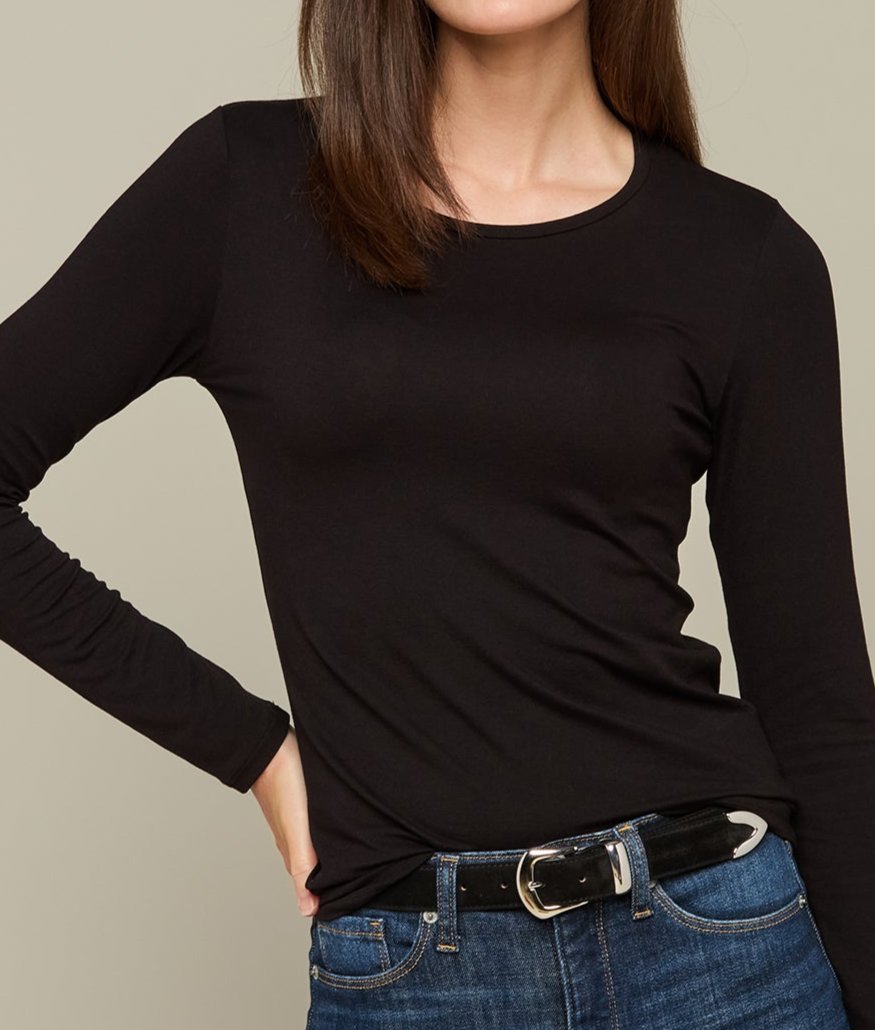 The Long Sleeve Soft Touch Tee combines comfort with versatile style. making it a wardrobe essential. Crafted from a blend of viscose and elastane. the fabric offers a silky-smooth feel against the skin. ensuring all-day breathability. style. and comfort.