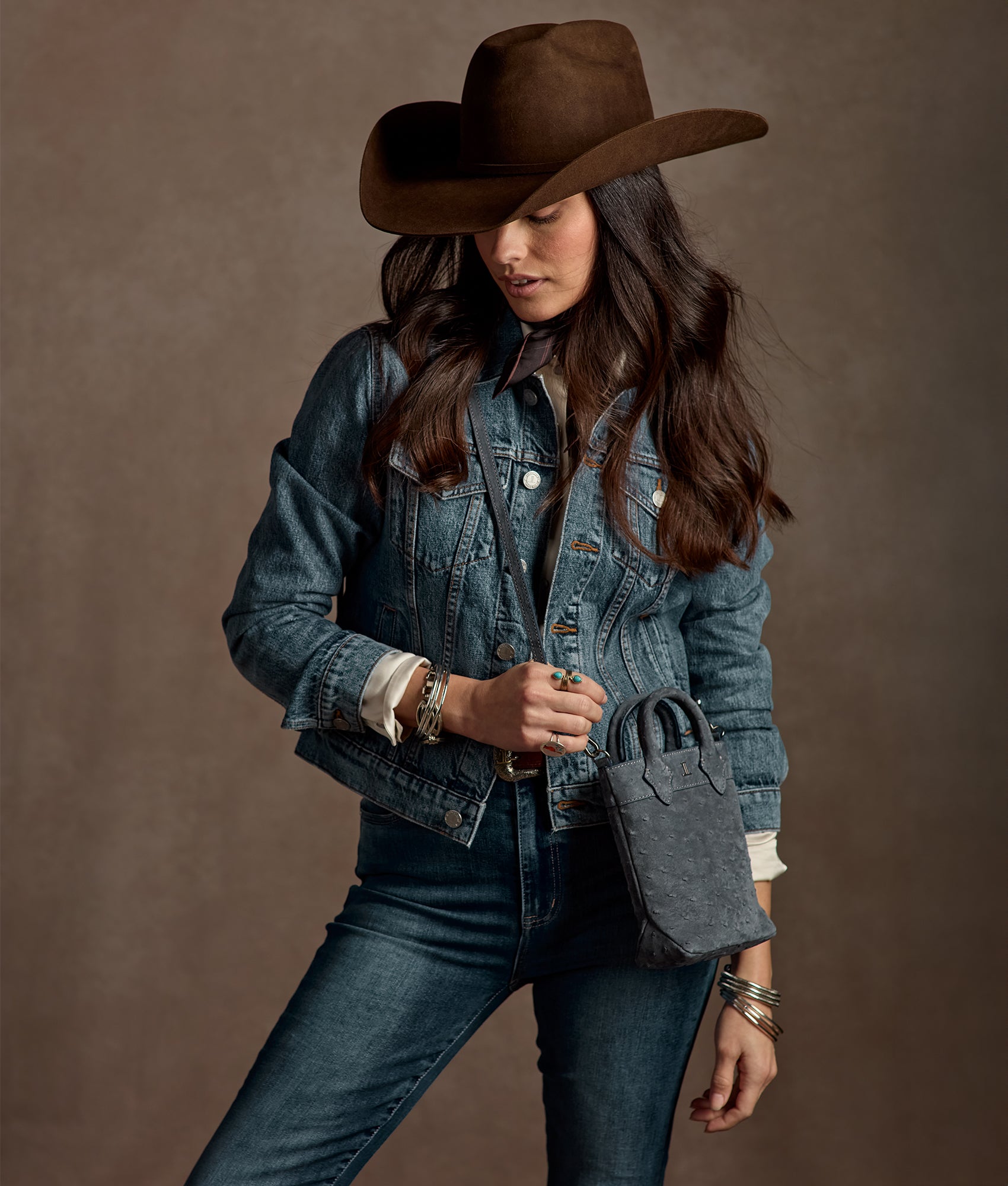 The premium Mini Lola Exotic Shopper is handmade from traditional leather techniques??exotic elegance with fashion-forward flair. This fun bag is crafted from the most Sueded Ostrich. A fresh take on a traditional design elevates the cowgirl repertoire.