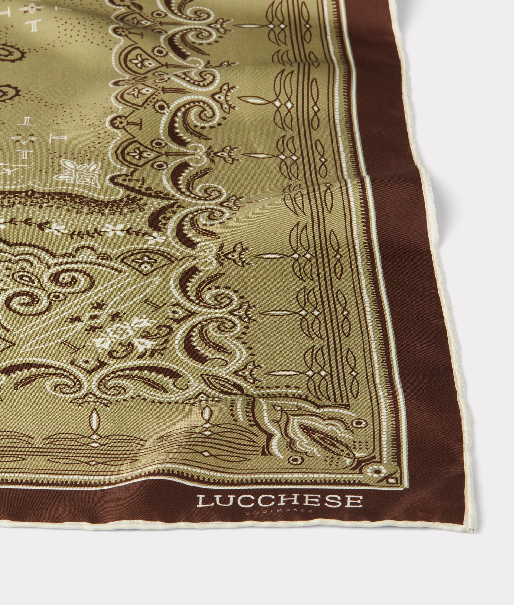 Based on our iconic Mirrored-L logo. this piece showcases subtle nods of Lucchese. Adorned with intricate. hand-drawn patterns inspired by classic western motifs. each design is a work of art. reflecting the spirit and heritage of the American West. The rich olive hue evokes the evergreen tones of the holidays and pairs beautifully with Black Cherry. Carefully designed to complement any outfit. adding a touch of opulence and style. whether worn around the neck. as a headscarf. or tied to a handbag.