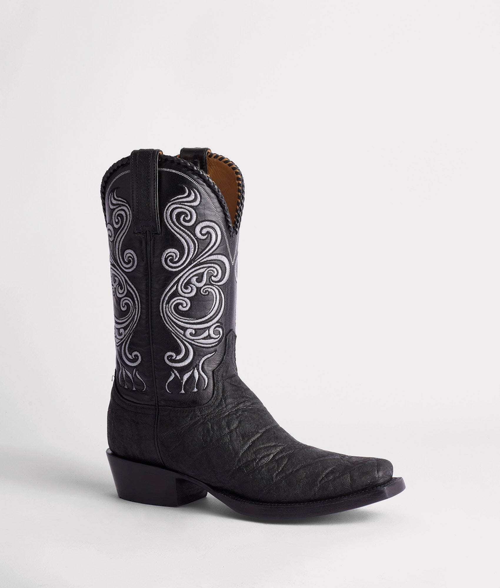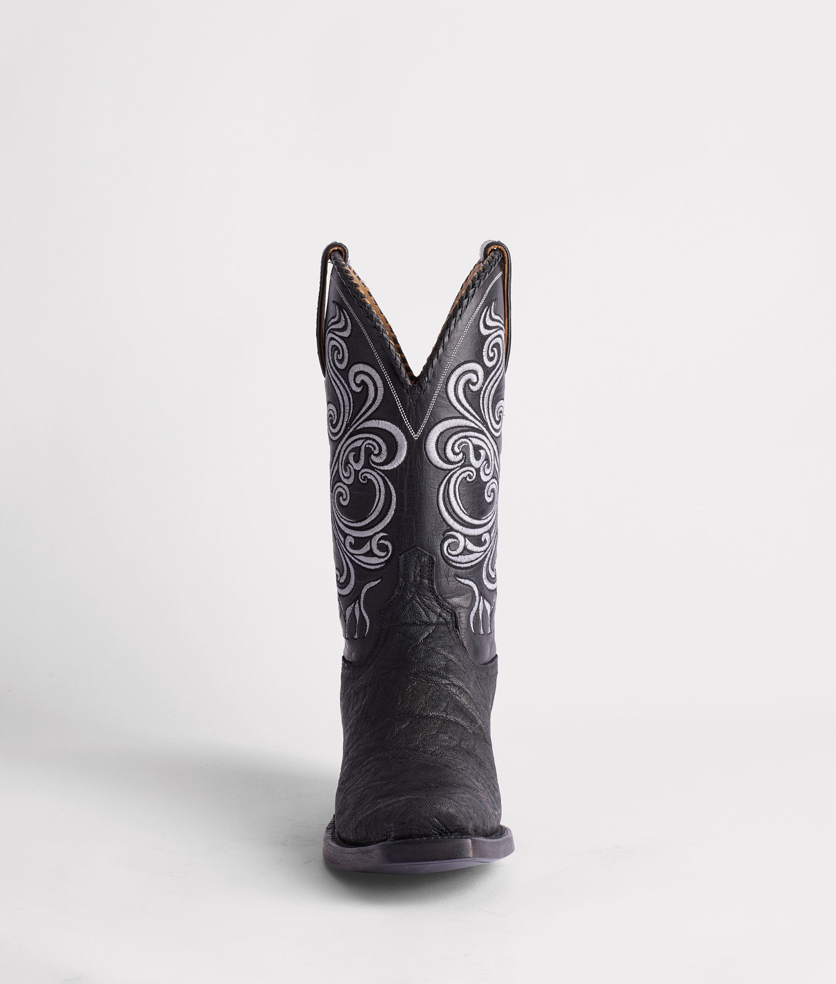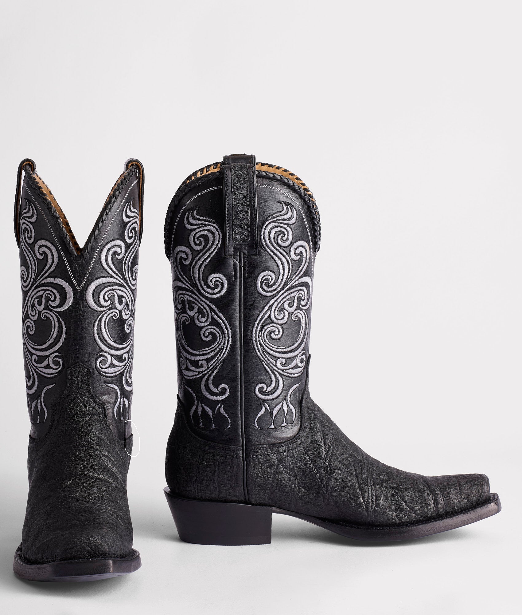 Crafted from rugged Elephant hide. this Western silhouette inherited its name from the mining town in Southwest Texas along the bluffs of the Rio Grande Valley. Terlingua. Untamed and wildly beautiful. the Terlingua takes the Muerte stitch pattern and cleverly reinterprets it as a skull. Midsoles are added to the boots to offer more stability and durability. affording their owner an extended lifetime of wear. Enriched by a whipstitch scallop detail. Terlingua is a touch of elegance to an otherwise daring look. Handmade in Texas.