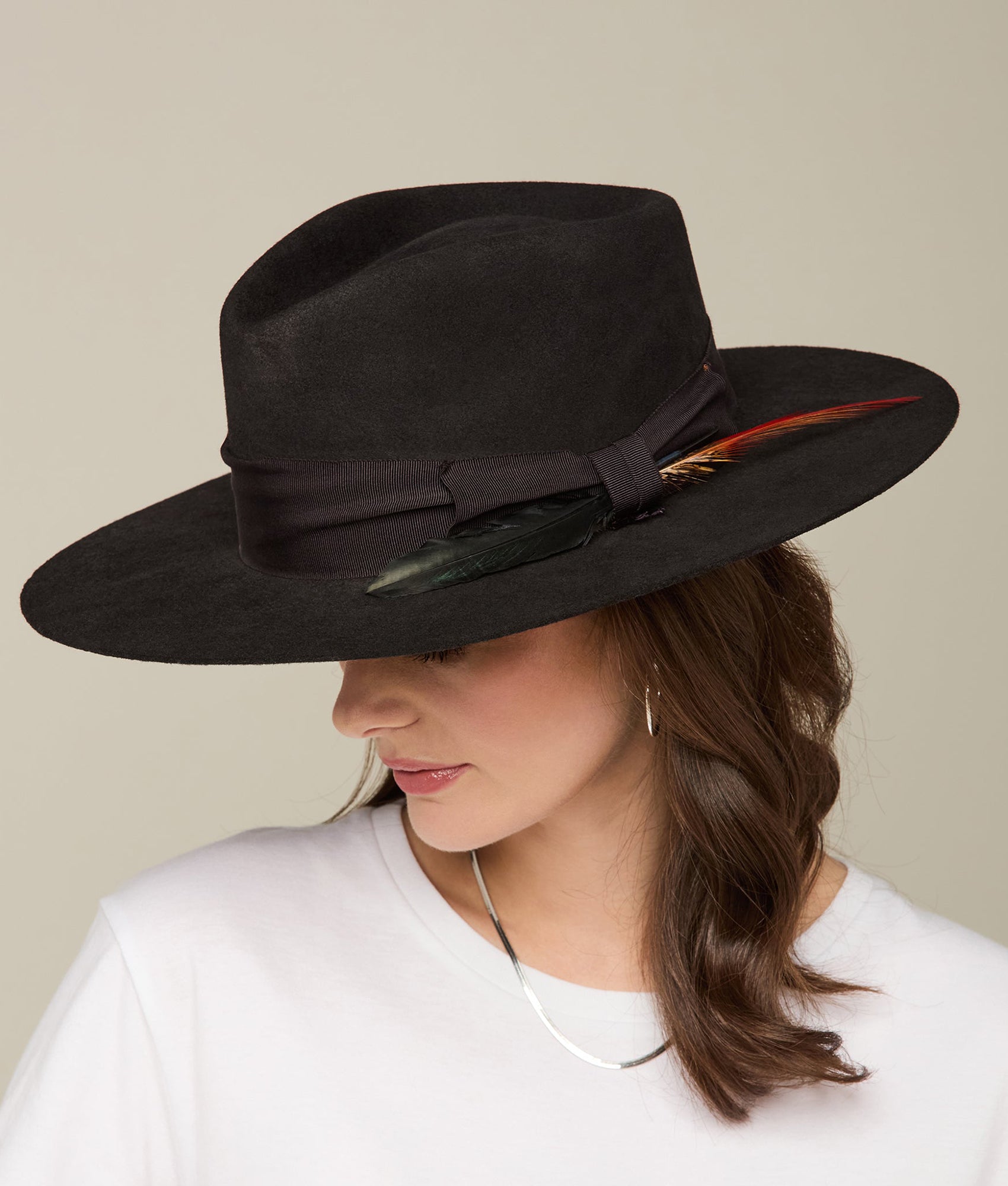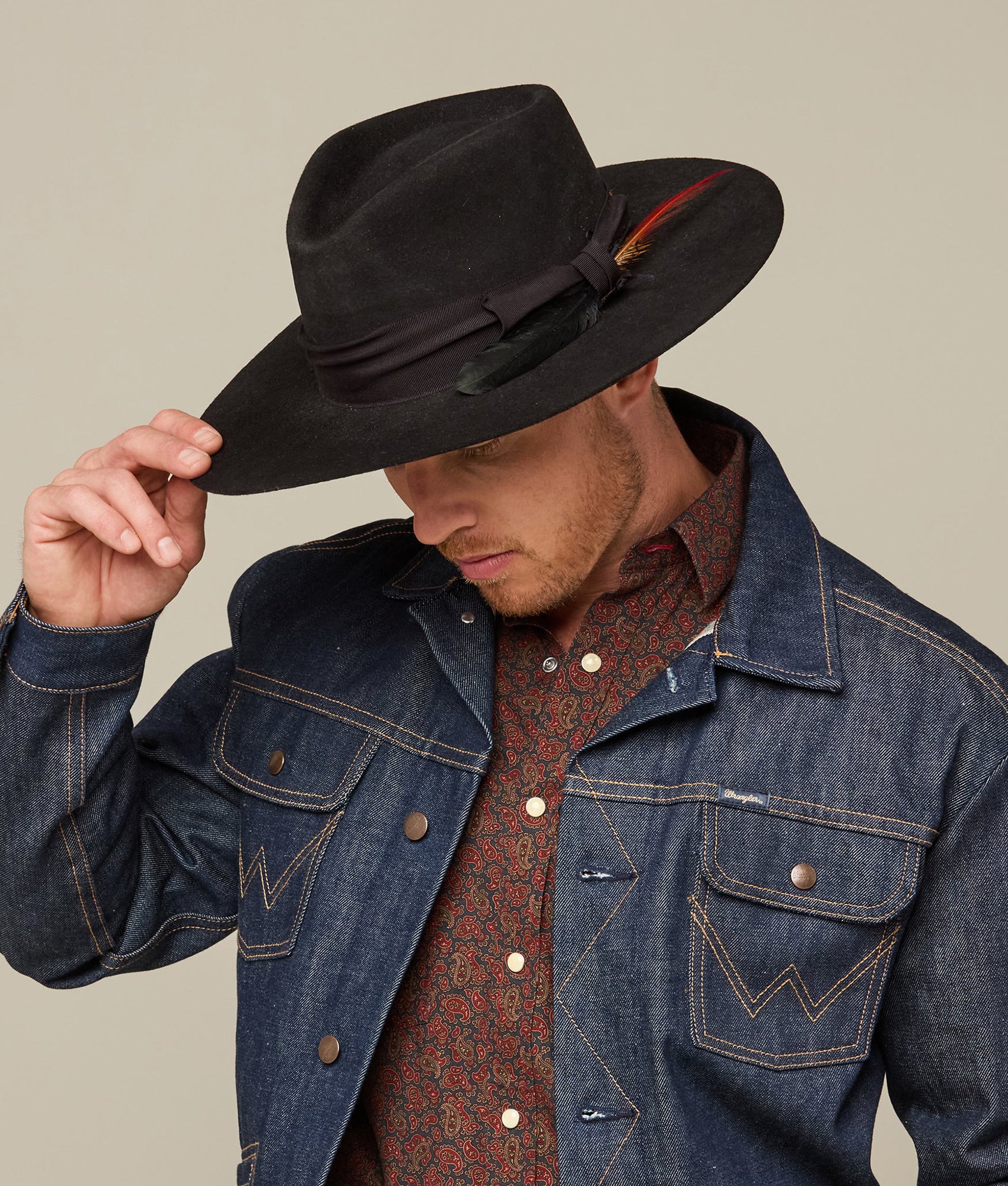 Part of our exclusive Lucchese hat collection. the Capitol is a hat that pays homage to the Lone Star State. Inspired by the the Texas State Capitol. this piece is a true showstopper. Contemporary to the eye and western at heart. this beautiful topper is 100% custom made and hand-shaped from 100% Bolivian Wool. A Fedora Pich front crown achieves a look of the modern cowboy and outdoorsman. A grosgrain ribbon adorned with two ornate feathers complete this hats personality – one pheasant and one goose. A sheep skin sweatband allow a soft and moisture-wicking place for your head to rest.
