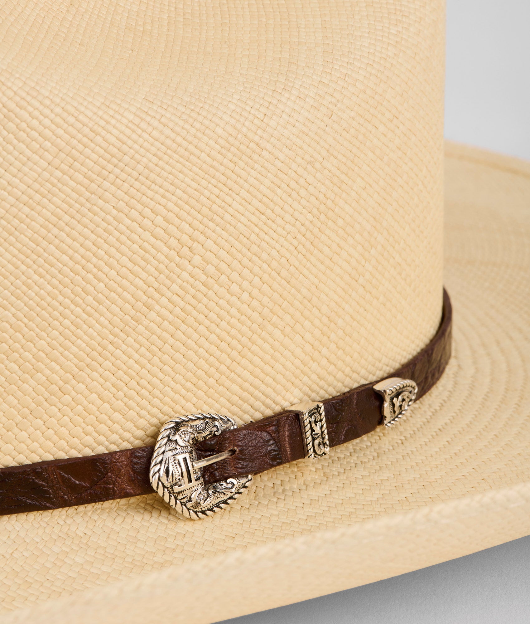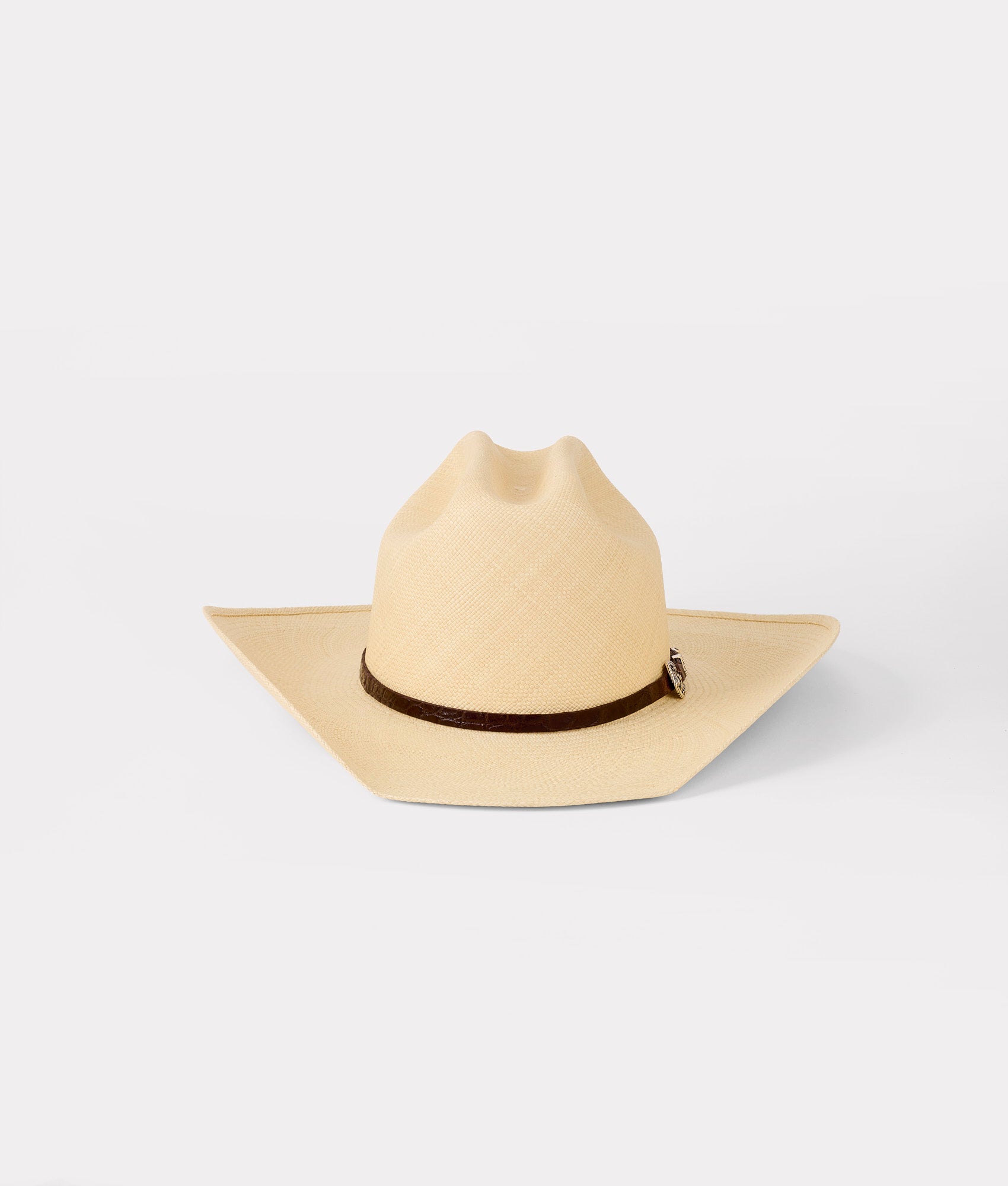 Named after the historic Texas Nueces River. this hat embodies the artistry of traditional craftsmanship. Made from 100% handwoven Toquilla straw. its distinct. natural pigment reflects the rich texture and subtle variations of the material itself. while the ultra-fine grade weave highlights the skill and precision of the artisan who created it. The weave not only serves as a testament to the hat’s durability but also allows for breathability. ensuring comfort under the sun. The hat features a classic cattleman crown and a wide western flange brim. The Alligator hat band adds a signature Lucchese element to a fresh piece. Its finishing touch??a 3-piece silver buckle set adorned with two real diamonds??elevates the hat to a work of art.