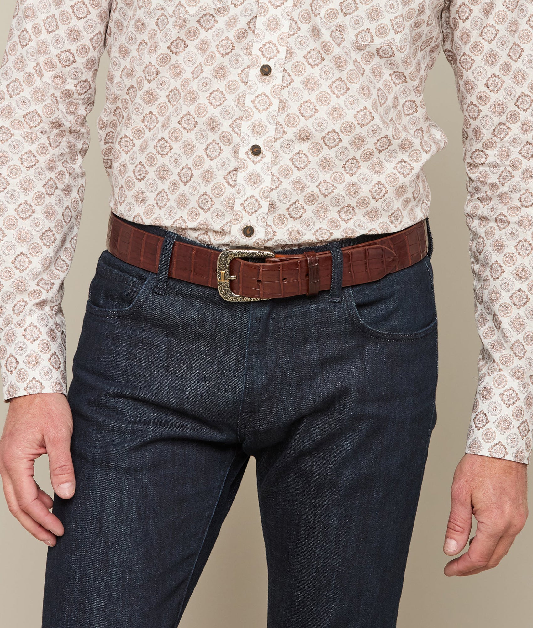 Lucchese’s exotic belt made with caiman crocodile. The belt’s ultra belly caiman leather not only provides sleek style. but also ensures durability for long lasting use. Adorned with a detailed silver plated buckle. this belt pays homage to the classic West. Handmade in Texas. 1.5 wide Removable buckle